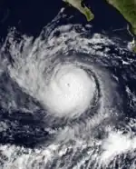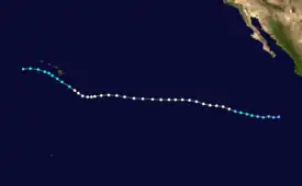 A tropical wave crossed Central America on August 11, and then became an area of low pressure. While located of the coast of Mexico it became better organized on August 14. This was enough to warrant an upgrade to Tropical Depression Eleven-E.[41] This system slowly became better organized, but northerly wind shear prevent rapid intensification.[42] Initially, this system was slow to intensify.[43] After strengthening into Tropical Storm Ismael, it closely paralleled the coast of Mexico, Ismael turned to the west. It would maintain that generally westerly direction for the rest of its long path across the Pacific Ocean. The system steadily intensified,[44] and by August 16, Ismael had developed a fair outflow.[45] It reached hurricane strength later that day.[44] Continuing to intensify, the hurricane reached Category 2 intensity. However, the system was not expect to intensify further due to cool sea surface temperatures.[46] However, Ismael managed reached Category 3 status. It then reached a peak intensity of 120 mph (195 km/h) and a peak pressure of 955 millibars. Shortly after its peak, Ismael underwent fluctuations in strength. On August 21, Ismael passed over cooler waters. In addition, the storm encountered strong wind shear. The hostile environment continued to take its toll on Ismael, and it weakened to a tropical storm on August 23. Ismael dissipated not long after weakening to a depression on August 25. The remains of Ismael, which was only a swirl of clouds, dissipated near Hawaii.[44]