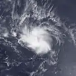 On July 10, a tropical depression formed far from land. Upon formation, there was uncertainty of the location of center.[22] Shortly thereafter, the system became sheared and further intensification was no longer anticipated.[23] On July 11, the low-level center became displaced form the deep convection.[24] the next day, the center was relocated, and moved to the west. While the NHC noted the possibility of intensification, the depression was forecasted to dissipate in 36 hours.[25] It failed to intensify,[20] and moved into the Central Pacific on July 14. The fast-moving tropical depression dissipated two days later. The remnants of the depression passed far to the south of Hawaii, thus there was no damage.[21]