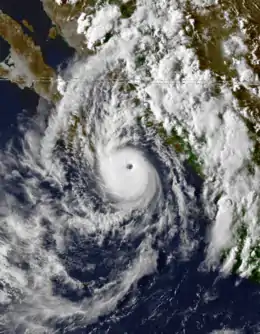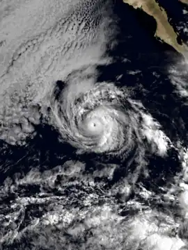 On August 25, the seasons fourteenth tropical depression formed off the coast of Sonora, Mexico from a mesoscale convective system. A small cyclone, the system rapidly intensified over the warm waters of the Gulf of California, becoming Tropical Storm Kiko hours after forming and a hurricane 12 hours later. The fast rate of strengthening continued until August 27, at which time Kiko peaked in intensity as a strong Category 3 hurricane with winds of 120 mph (195 km/h) and a minimum pressure of 955 mbar (hPa; 28.2 inHg). Slight weakening occurred before the storm made landfall near Punta Arena, Mexico,[54] becoming one of the strongest storms to make landfall in Mexico since reliable records began in 1949.[3] The hurricane quickly weakened as it moved over the Baja Peninsula, being downgraded to a tropical depression before emerging into the Pacific Ocean on August 28. The following day, the remnants of Kiko were absorbed by the nearby Hurricane Lorena.[54]