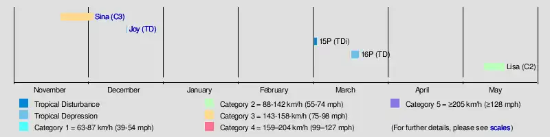 The basin then remained quiet until March when three significant tropical depressions including 15 and 16P were observed within the Coral Sea/Australian region, which did not develop into tropical cyclones but were subject to gale warnings.[6] 15P was first noted on March 3, while it was located about 900 km (560 mi) to the east of the Solomon Islands and over the next couple of days subsequently moved south-westwards and out of the South Pacific basin during the next day.[7] 16P was first noted on March 14, while located about 300 km (185 mi) to the southeast of Honiara in the Solomon Islands.[8][A 1] Over the next couple of days the system moved towards the south-east before the JTWC designated the system 16P and initiated advisories on it during March 18, after it had moved into the South Pacific basin.[9] Over the next couple of days the system, moved towards the south-southeast, before it turned towards the southwest and passed over New Caledonia on March 20, before it was last noted during the next day moving out of the basin.[8] The final tropical cyclone of the season, Lisa, moved into the Southern Pacific on May 11 at its peak intensity of 110 km/h (75 mph).[1][10] During the next day as the storm moved towards the subtropical jet, Lisa rapidly weakened into a tropical depression before passing over Anatom Island without causing any significant damage.[1] After the season both the names Sina and Joy were retired from the naming lists for the region, while it was determined that a weak gale force tropical cyclone had affected Tonga between December 14–17.[2][11][12]