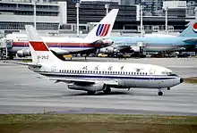 A Xiamen Airlines Boeing 737-200 wearing the CAAC livery, similar to the accident aircraft. The Korean Air 747 in the background was involved in the hijacking of Lufthansa Flight 649 | |