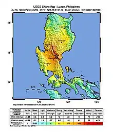 The 1990 Luzon earthquake struck the island of Luzon in the Philippines at 4:26 p.m. on July 16 (PDT) or 3:26 p.m. (PST) with an estimated moment magnitude of 7.7 and a maximum Mercalli intensity of IX (Violent) and produced a 125 km-long ground rupture that stretched from Dingalan, Aurora to Kayapa, Nueva Vizcaya. The event was a result of strike-slip movements along the Philippine Fault and the Digdig Fault within the Philippine Fault System. The earthquake's epicenter was near the town of Rizal, Nueva Ecija, northeast of Cabanatuan.[6] An estimated 1,621 people were killed,[7][8] most of the fatalities located in Central Luzon and the Cordillera region.