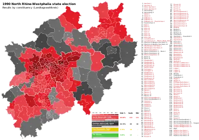 The SPD successfully retained their parliamentary majority with minor losses, taking slightly under 50% of the vote. The opposition Christian Democratic Union (CDU) failed to recover from their 1985 losses, recording 36.7%; the Free Democratic Party (FDP) likewise remained essentially level on 6% and 14 seats. The Greens narrowly passed the 5% electoral threshold and entered the Landtag for the first time with 12 seats. The margin of the SPD's victory saw them win 121 of the 151 single-member constituencies, resulting in overhang and leveling seats boosting the Landtag to 237 members. In February 1992, it gained two more due to an election review which reversed the result in the Märkischer Kreis IV constituency, resulting in an additional overhang seat for the SPD and a new leveling seat for the CDU.[1]