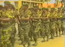 As a result of the Congo Crisis of 1960–1965, army commander Mobutu Sese Seko seized power in the newly independent Congo,[1][2] renaming the country to "Zaire" in 1972[3] and running it as his "poorly managed private estate" for 32 years.[4] The Congolese National Army (Armée Nationale Congolaise) and its successor, the Zairian Armed Forces (Forces Armées Zaïroises, FAZ) were one of his main pillars of support.[3][5] Mobutu established a totalitarian military dictatorship[6] and initially presided over a period of economic growth.[7] His government portrayed its policies as populist[7] and spent much money on economic as well as food subsidies, earning substantial goodwill by the population.[8] However, his rule ultimately proved to be "one of the most catastrophic examples of dictatorship" in African history.[4] He embezzled billions of US$,[9] spent large sums on idiosyncratic projects and for his lavish lifestyle, while developing a country-wide system of patronage which encouraged extreme corruption and graft.[10] The Zairian security forces violently suppressed any opposition.[11] From 1974, the Zairian economy began to noticeably struggle due to changes in the world economy, misgovernment, and corruption;[12] however, Mobutu was able to keep his government afloat thanks to extensive loans by his international supporters like the United States.[13] The Western world regarded him as a reliable and strategic anti-Communist ally in the Cold War.[4][13]