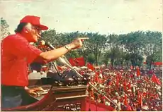 Under the leadership of Wahono, who had been elected chairman of Golkar in the 1988 Golkar National Conference,[9] Golkar's largest challenge ahead of the 1992 elections, was in retaining its large 73.11% victory it had received in 1987. Its biggest threat to accomplishing this goal was the PDI, under the leadership of Suryadi, which had begun to increasingly use the symbols of former president Sukarno to gain support.[10] Golkar's 1992 campaign began with a kick-off rally in Surabaya, East Java, to excite and get out the vote for Golkar. During the campaign, Golkar mainly campaigned on stability and the economy, with party spokesman and former party vice chairman Sarwono Kusumaatmadja arguing that it was difficult to bring about change without risking the unity of the nation, and that the priority of the nation should be to build a strong economic basis.[11]