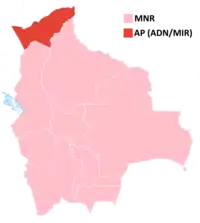 | MNR–MRTKL | Gonzalo Sánchez de Lozada | 585,837 | 35.55 | 52 | +12 | 17 | +8 | ||