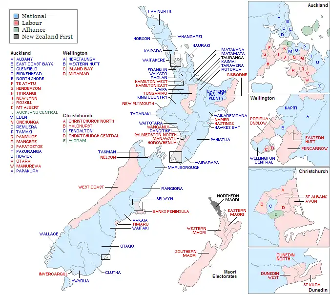 Based on the 1991 New Zealand census, an electoral redistribution was carried out; the last one had been carried out in 1987 based on the previous census in 1986.[10] This resulted in the abolition of nine electorates, and the creation of eleven new electorates. Through an amendment in the Electoral Act in 1965, the number of electorates in the South Island was fixed at 25, so the new electorates increased the number of the North Island electorates by two.[11] In the South Island, one electorate was abolished (Ashburton), and one electorate was recreated (Rakaia). In the North Island, five electorates were newly created (Eastern Bay of Plenty, Far North, Howick, Matakana, and Wellington-Karori), five electorates were recreated (Franklin, Hauraki, Henderson, Onslow, and Waitakere), and eight electorates were abolished (Bay of Islands, Clevedon, Coromandel, East Cape, Maramarua, Ohariu, Wellington Central, and West Auckland).