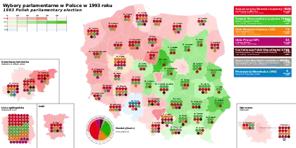 Parliamentary elections were held in Poland on 19 September 1993.[1] In the Sejm elections, 52.13% of citizens cast their votes, and 95.7% of them were counted as valid. In the Senate elections, 52.1% of citizens cast their votes, and 97.07% were valid. The elections were won by the left-wing parties of the Democratic Left Alliance and the Polish People's Party, who formed a coalition government. The coalition was just 4 seats short of a supermajority.