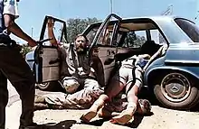 The convoy of AWB vehicles had been firing into roadside houses as they passed through a poor black area of Mafikeng.[21] Members of the Bophuthatswana police had set up an ambush and opened fire on the AWB convoy, killing one AWB militant, Francois Alwyn Venter, and wounding eleven others. Although most of the AWB vehicles managed to escape, the last vehicle was left behind. AWB Colonel Alwyn Wolfaardt, AWB General Nicolaas Fourie and Veldkornet (Field Cornet) Jacobus Stephanus Uys were driving a blue Mercedes-Benz W108 at the end of the convoy. The driver, Fourie, was shot in the neck; another passenger, Wolfaardt; in the arm and the remaining passenger, Uys, in the leg. Wolfaardt and Uys were wounded and Fourie died almost instantly. Wolfaardt stumbled out of the car and brandished a handgun but was advised by the onlookers not to start shooting. A Bophuthatswana police officer relieved him of the weapon. Half a dozen reporters who had stumbled on to the scene recorded what followed. A crowd of locals mingling with the reporters started taunting the two survivors. "Black bastards," muttered Uys, before realizing the folly of his words and apologizing. A journalist was then told by a policeman, "We want to kill these fucking dogs. They have killed women. They are animals, not people." A journalist approached and spoke to Wolfaardt, asking if he was a member of the AWB. Wolfaardt confirmed this, reporting that they had been dispatched from Naboomspruit. He then pleaded for the lives of him and his injured comrade, "Please God, help us! Get us some medical help!", he said. In response, a police officer angrily shouting, "Who do you think you are? What are you doing in my country?" strolled up to the two men, pointed his R4 rifle, and fired two bullets into each men at point-blank range, firing a further two into the body of Fourie, which he then proceeded to kick in the ribs. The execution was captured by the nearby journalists and broadcast worldwide.[22][23]