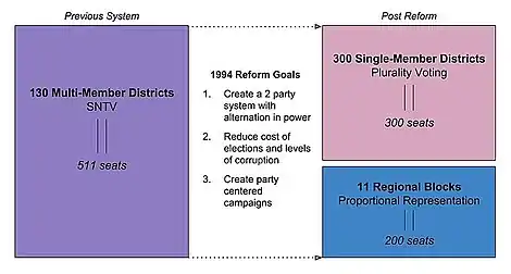 Finally, on January 29, 1994, the parties agreed upon and passed the electoral reform law. This law changed the electoral system from having 130 MMD and 511 seats to the new system of 300 SMD seats elected through plurality voting, and 200 proportional representation seats elected from eleven regional blocs.[4]