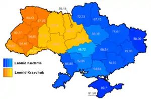 In the first round Kravchuk was supported by the People's Movement (which had originally collected signatures for Volodymyr Lanovyi) and the Democratic Association, an alliance of right-wing parties that viewed Kuchma as being pro-Russian. Kuchma was supported by the Interregional Bloc of Reforms, and Socialist Party candidate Oleksandr Moroz was supported by the Communist Party and Peasant Party.[2] After he was knocked out, the Communists supported Kuchma in the second round.[3]