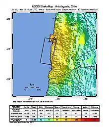 At 1:11 local time on July 30, 1995, a large earthquake struck northern Chile. The Mw 8.0 earthquake struck at a depth of 46 km (29 mi) with an epicenter near Antofagasta.[1] The focal mechanism of this earthquake indicates thrust faulting along the subduction zone, which is consistent with other large earthquakes along the plate boundary in this region.[11][12] The maximum slip was 5.4 m (18 ft) along a 180 km × 70 km (112 mi × 43 mi) zone of rupture.[13][11][14] Foreshock activity was minimal, but large aftershocks lasted a while after the mainshock, with the largest being a shallower Mw 6.4 event with a Modified Mercalli Intensity of VII three days later.[15] The event occurred at the edge of a known seismic gap that produced the 1877 Iquique earthquake, and research suggests that this earthquake may have put more stress on the region as well.[16] The event is not thought to have ruptured the shallow plate interface in the region, leaving it susceptible to future large megathrust earthquakes such as the 1877 event.[16]