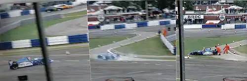 Schumacher and Hill now had similar fuel loads, but Hill had a fresh set of tyres and immediately began pressuring Schumacher, quickly reducing the gap to less than half-a-second. On lap 46, Hill attempted a passing manoeuvre at Stowe corner, but was unable to complete it, due to the presence of Boullion's lapped Sauber.[29] Further around the lap, Hill tried again, diving up the inside of Schumacher at the entry to the Priory left-hander, but Schumacher turned in to take the racing line and the two collided, both spinning into the gravel trap, which caused their retirement from the race.[39] The retirement of the two leaders promoted their teammates into their own battle for the lead; the two almost colliding at the same corner as Coulthard attempted to pass Herbert by making a lunge up the inside of his car, as Hill had done to Schumacher.[40] Coulthard had not been informed about his stop-go penalty by the team, as they did not want to distract him, but he saw the penalty notification on one of the large television screens situated around the circuit.[41] He passed Herbert on lap 49, but took his penalty two laps later and dropped to third position, behind Alesi. The Ferrari driver was still close behind Herbert, but cut his pace in the final laps as his 412T2's oil pressure began to fade.[35] With the top three positions settled, attention switched to Barrichello, who had closed up to the back of Blundell's car and was faster than the McLaren driver.[42] On the penultimate lap, Barrichello lined up his car to attempt a pass, but Blundell defended his position and the two collided: Barrichello crashed out, but Blundell was able to continue with a punctured left-rear tyre which allowed Panis to overtake him on the last lap.[35] It was the second year in succession that Barrichello had collided with a McLaren driver in the closing stages, as he had made contact with Häkkinen on the last corner of the last lap the previous year when also battling for fourth place.[43]