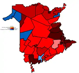 ![]() Map of New Brunswick's ridings coloured in based on the winning parties and their popular vote | |||||||||||||||||||||||||||||||||||||||||||||||||||||||||||||||||||||||