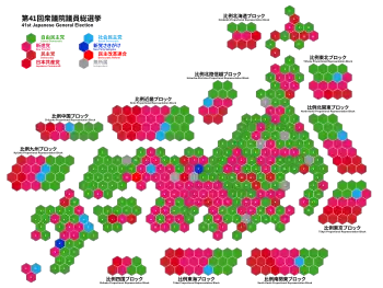 The election was the first election under the new electoral system established in 1993. The multi-member constituencies were replaced with single member districts, and separate party list seats chosen proportionately.[2] Prior to 1993, each district was represented by multiple members, sometimes from the same party, leading to severe corruption and intra-party competition. The latter consequence resulted in defections from the LDP and the creation of opposition parties that advocated for a new electoral system. As a result, a new system emerged, adopting both the single member district (SMD) competition and proportional representation (PR).[2] Under the new system, each district has only one representative portraying a wide range of interests for his or her district. A separate party-list was introduced for voters to choose their favored party (in addition to votes for individual candidates) as a way to more accurately approximate the seats in the House of Representatives of Japan to the actual party votes in an effort to achieve more proportional representation.