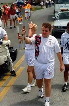 The 1996 Summer Olympics torch relay was run from April 27, 1996, until July 19, 1996, prior to the 1996 Summer Olympics in Atlanta.[1] The route covered 26,875 kilometers (16,699 mi) across the United States and included a trek on the Pony Express, a ride on the Union Pacific Railroad, and a torch was taken into outer space for the first time. The relay involved over 12,000 torchbearers, including Muhammad Ali, who was chosen to ignite the Olympic cauldron.[2]