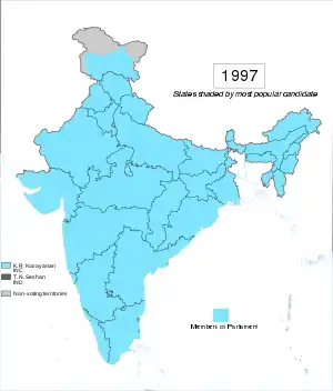The 11th presidential election of India was held on 17 July 1997. With 956,290 votes, K. R. Narayanan overcame his nearest rival T. N. Seshan who received 50,631 votes.[1] Narayanan was the first dalit to be elected President of India.