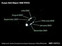 1998 WW31, is a non-resonant trans-Neptunian object and binary system from the Kuiper belt located in the outermost region of the Solar System, approximately 148 kilometers (92 miles) in diameter. It was first observed on 18 November 1998, by American astronomer Marc Buie and Robert Millis at the Kitt Peak National Observatory in Arizona, United States.[2][3][1] In December 2000, a minor-planet moon, designated S/2000 (1998 WW31) 1 with a diameter of 123 kilometers (76 miles), was discovered in its orbit.[7] After Charon in 1978, it was the first of nearly 100 satellites since discovered in the outer Solar System.[3][7]