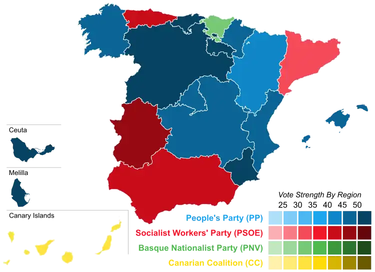 - Results for CN, not including Aragon, the Canary Islands, Galicia and the Valencian Community (1.35%), PEP, not including Cantabria, Castile and León, Castilla–La Mancha, La Rioja and Madrid (1.26%) and EV–CEC (0.23%) in the 1994 election.