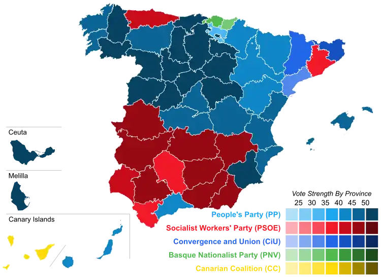 The ruling People's Party (PP)—which for the first time contested a nationwide election in Spain while in government—emerged as the largest political force in the country, albeit with a diminished victory margin than in the previous election held in 1994. The Spanish Socialist Workers' Party (PSOE), in opposition for the first time since 1982, recovered some ground from its previous result. Overall, the PP lead decreased from 9.3 to 4.4 percentage points, though this was an increase from the 1.2 points between both parties in the 1996 general election. United Left (IU) lost half of its votes and parliamentary representation amid internal divisions—Initiative for Catalonia (IC) and the New Left (NI) had split from the larger alliance in 1997—policy differences over their relationship with the PSOE and the deteriorating health condition of IU's maverick leader, Julio Anguita.