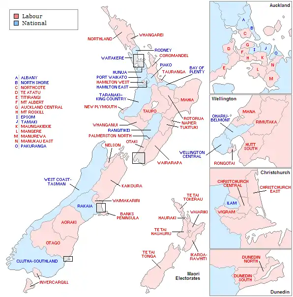 - By Labour: Banks Peninsula, Hamilton West, Maungakiekie, Northcote, Rotorua and Wairarapa were captured from National. Te Tai Hauauru and Te Tai Tokerau were captured from Mauri Pacific. Wellington Central was captured from ACT. Te Tai Tonga was captured from New Zealand First.