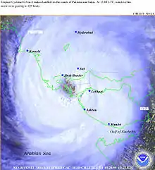 ![]() Satellite image of the cyclone at peak intensity making landfall in Pakistan on May 20. | |