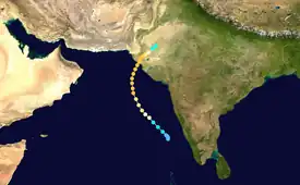 In India, officials evacuated more than 50,000 from coastal towns and cities as a precaution.[1] However, the powerful cyclone caused relatively little damage during its passage. Moderate rainfall was recorded across Gujarat and only one person was killed. Some areas were cut off from the surrounding region after strong winds, estimated to have been between 120 and 150 km/h (75 and 93 mph) downed power lines.[2]