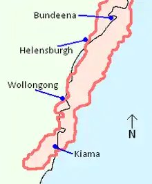 The storm cell formed at 4:25 pm AEST to the north of Nowra, roughly 115 km (71 mi) south-southwest of Sydney. After forming, it initially headed towards the coast in a northeasterly direction. The cell passed just to the west of Kiama at around 5:15 pm and gained a 'severe' classification from the Bureau of Meteorology at the same time.[15] 'Severe' is a classification used by the Bureau of Meteorology for thunderstorms which meet a specific criteria, namely producing hailstones with a diameter of 2 cm (0.8 in) or more, wind gusts of 90 km/h (56 mph) or greater and flash flooding, or tornadoes. This classification is also used by the Bureau to classify the attributes of a storm at any given time during its life.[7][16]