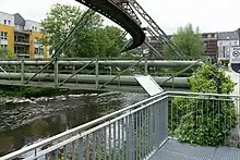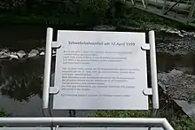 On 12 April 2000, the first anniversary of the fateful day, Wuppertal's chief mayor (Oberbürgermeister) Hans Kremendahl and WSW's chairman of the board Rolf Krumsiek unveiled a memorial plaque to the victims of the accident. It can be found at Robert-Daum-Platz station.[5] Later, on 18 April 2009, days after the accident's tenth anniversary, another memorial plaque was unveiled at a spot much nearer the accident site, on the north bank of the Wupper, a few metres (yards) from the steam pipe bridge onto which the train fell (and which has since been repaired).[13]