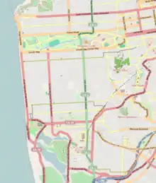 Despite being a city street, the avenue between Junipero Serra Boulevard and Golden Gate Park is designated as part of the State Highway 1.[1][2] The portion of the avenue between Junipero Serra Boulevard and Eucalyptus Drive is also run by the Muni Metro M Ocean View light rail, providing access to Downtown.[3] 19th Avenue is located between 18th Avenue and 20th Avenue.
