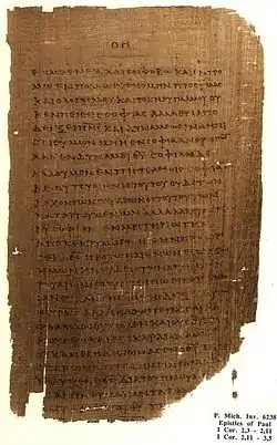 ![]() Page 78 of Papyrus 46 (c. AD 200) showing 1 Corinthians 2:3–11. P. Mich Inv. 6238. University of Michigan. | |