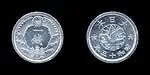 On November 29, 1938 the act was revised and one sen coins were struck in aluminum as copper was needed for munitions.[11][28] The diameter of the one sen coin was reduced from 23 down to 17.6mm, while the weight dropped from 3.75 to 0.90 grams.[29] Although the coins were now smaller and lighter, the crow and waves design did not change.[30] Using aluminum allowed coins to be produced in large numbers because the alloy is naturally soft, did not require annealing, and extended the life of the dies.[30] The design of the one sen coin changed again in 1941, featuring Mount Fuji on the reverse representing Hakkō ichiu.[31][32] The obverse side shows the character "ichi" or "one" representing the value of the coin. This feature was allegedly handwritten by Isao Kawada, who was the minister of finance at the time.[31] The diameter of the coin was reduced from 17.6 to 16mm while the weight dropped from 0.90 to 0.65 grams.[29] In April 1943 the Japanese government announced plans to use tin in coinage as aluminum was now needed for more aircraft.[11][33] One sen coins had their aluminum content dropped this year from 0.65 to 0.55g.[11] As World War II drew to a close the amount of available aluminum became depleted.[11][34]