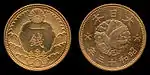 Tin and zinc eventually replaced aluminum for one sen coins when they were issued in March 1944.[33] The final design used for the coins features a chrysanthemum crest with value on the obverse, and inscriptions on the reverse. Tin was not an ideal choice for money as the metal is heat-sensitive and soft, but the Japanese government had no alternatives.[34] Supplies came from occupied Southeast Asia where the metal was abundantly produced.[34] One sen coins eventually became impossible to produce due to deteriorating conditions, and were discontinued when the war ended in 1945.[35] Unissued one sen coins made of porcelain were produced in the final months of the war and were destroyed afterwards.[11][34][35] One sen coins were eventually demonetized at the end of 1953 when the Japanese government passed a law abolishing subsidiary coinage in favor of the yen.[36] Currencies of less than one yen were rarely used by this time due to excessive post-war inflation.[37]