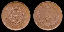 Production continued for a few years before it was stopped as no coins are dated from year 11 or 12 (1878 and 1879). It is theorized that the aftermath of the Satsuma Rebellion could have left an impact.[10] When production resumed in 1880 (year 13), the scales on the obverse dragon design were changed from a square to a "V" shaped pattern.[11] One sen coins using the first dragon design were made again until 1888 (year 21), when they were stopped due to mass production and a slight oversupply.[10] As with several other denominations it's possible that non circulating one sen dragon coins were made again in 1892 (year 25) for display at the World's Columbian Exposition.[lower-alpha 1] The Japanese government officially switched to the gold standard on October 1, 1897 and new coinage laws were adopted.[14] Changes for the one sen coin included a reduction of copper content by 3%, while the weight and size of the coins were left the same as before.[15] Both sides of the coin received a brand new design as some of the older elements were no longer viewed positively. The dragon on the obverse side in particular was removed due to the First Sino-Japanese War which lasted from 1894 to 1895.[11][16][lower-alpha 2] A rice stalk wreath was chosen to replace the dragon, while the reverse side of the coin received a sunburst design.[17]
