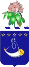 The shield is blue, representative of the original organization. The powder horn is adapted from the State coat of arms. The five mullets symbolize the wars in which the original regiment participated.