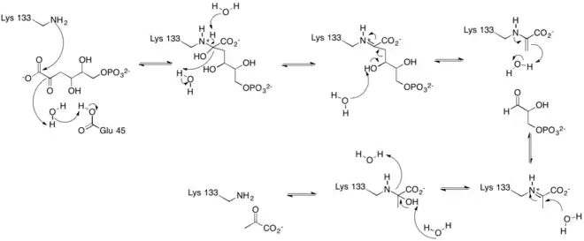 The active site contains the zwitterionic pair Glu-45/Lys-133.[9] The Lysine, which is involved in the formation of the Schiff base is coordinated by a phosphate ion and two solvent water molecules.[6][7] The first water molecule serves as a shuttle between the Glutamate and the substrate, staying bound to the enzyme throughout the catalytic cycle.[7] The second water molecule is a product of the dehydration of the carbinolamine that leads to the formation of the Schiff base.[7] It also functions as the nucleophile during hydrolysis of the enzyme-product Schiff base, leading to the release of pyruvate.[7]