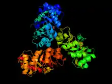 KDPG Aldolase was recently determined to be a trimer through crystallographic three-fold symmetry, with 225 residues.[2][3] The enzyme was determined to have a molecular weight of 23,942.[4] The trimer is stabilized primarily through hydrophobic interactions. The molecule has tertiary folding similar to triosephosphate isomerase and the A-domain of pyruvate kinase, forming an eight strand α/β-barrel structure.[3][5] The α/β-barrel structure is capped on one side by the N-terminal helix. The other side, the carboxylic side, contains the active site.[6] Each subunit contains a phosphate-ion bound in position of the aldolase binding site.[7] It has been found that there are four cysteinyl groups present in each subunit, with two readily accessible and two buried in the subunit.[8]