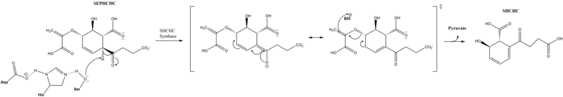 The active site contains a catalytic triad of syrine, histine and arginine, which is conserved across all mutants and is proposed to initiate the reaction.[1] The triad residues are located at Ser86, Asp210, and His232.[5] This triad is proposed to catalyze a proton extraction which triggers a transfer of electrons leading to the elimination of pyruvate and formation of SHCHC.[6] Originally, it was proposed that the transition state was stabilized by a nontraditional oxyanion hole. Now a traditional oxyanion hole is favored, but not definitive.[5]