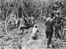 In early 1942, the 2/1st returned to Australia as part of the general transfer of Australian ground troops from the Middle East to the Pacific, following Japan's entry into the war. The battalion returned aboard the USS Westpoint,[9] and subsequently established itself around Ipswich, in Queensland, before being deployed to New Guinea in August aboard the transport Taroona,[10] at the height of the fighting against the Japanese during the Kokoda Track campaign. Initially, the pioneers undertook defensive tasks, with three companies being deployed forward to Owers Corner before moving to Uberi and then on to Imita Ridge, where the Australians sought to make a final stand against the advancing Japanese. There, the battalion occupied the extreme left hand position of a makeshift line alongside the 2/31st, 2/25th, 3rd and 2/33rd Battalions.[11] Later, as the tide of the campaign turned in favour of the Australians, the battalion conducted patrols and portage work along the track from September to November, before being reassigned to carry out mining and labouring work around 9-Mile Quarry, where three companies were deployed. A fourth company was also detached at this time to the Milne Bay area to improve the base's facilities; it remained in New Guinea until October 1943 before returning to Australia for rest and reorganisation aboard the USS Etolin.[12][3]
