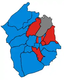 2000 local election results in Hyndburn. Blue is for wards won by the Conservatives. Red is for wards won by Labour. Grey is for wards that were not contested at this election.