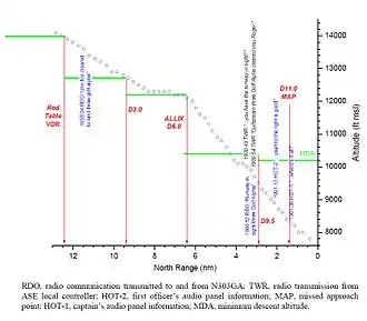 Part of the subsequent NTSB investigation[2] focused on the fact that the instrument approach at the destination airport was not legal for night landing, and the overall pressure applied on the charter company and flight crew by the charter customer to complete the flight into the original destination.[3] According to witnesses, the charter customer, upon learning that the flight might have to be diverted to an alternate airport due to the night landing restriction, had his business assistant call Avjet management, to "let them know that the airplane was not going to be redirected".[2]