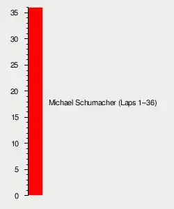 On the lap, after Verstappen hit him, Heideld attempted to pass de la Rosa on the left at the La Source hairpin. The two made contact with Heidfeld retiring immediately with front wing and suspension damage. De la Rosa entered the pit lane the lap after with car damage.[40][44] Up front, Michael Schumacher began to pull away from the rest of the field, increasing his lead over Fisichella to five seconds by the third lap.[41] One lap prior, Montoya's car pulled to one side though he overtook four cars before he retired from an engine failure.[38][40] On lap three, Trulli overtook Button for sixth. Button lost seventh to Alesi on the following lap. Michael Schumacher further extended his advantage to 14 seconds over Fisichella by lap six as Coulthard challenged the Benetton. Further back, Villeneuve passed Button for eighth. The first round of pit stops began at the conclusion of the lap when Trulli entered the pit lane. After his pit stop on lap seven, Panis crossed the white line to denote the pit lane exit, an infraction of the sporting regulations which entailed a ten-second stop-and-go penalty.[41]