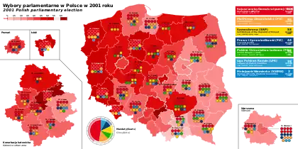 Parliamentary elections was held in Poland on 23 September 2001 to elect deputies to both houses of the National Assembly.[1] The election concluded with an overwhelming victory for the centre-left Democratic Left Alliance – Labor Union, the electoral coalition between the Democratic Left Alliance (SLD) and the Labour Union (UP), which captured 41% of the vote in the crucial lower house Sejm. The 2001 election is recognized as marking the emergence of both Civic Platform (PO) and Law and Justice (PiS) as players in Polish politics, while also witnessing the outright collapse of the Solidarity Electoral Action (AWS) and its former coalition partner, the Freedom Union (UW).