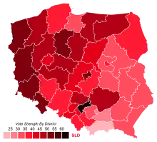The SLD triumphed in the final tally, receiving 41% percent of the vote, though shy of an outright parliamentary majority in the Sejm.[6] The party increased its representation by 52 seats, earning it 216 representatives, and returned to the Chancellery after a four-year period of sitting in opposition. Partly due to the fractious nature of its opponents, the SLD secured pluralities in all of Poland's voivodeships as well as in an overwhelming majority of the nation's powiats. On the centre right, Civic Platform entered parliament for the first time, coming in second place with nearly 13% of the vote.[6] The party stood relatively strong in Pomeranian Voivodeship.