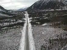 On October 23, 2002, there was a magnitude 6.7 earthquake located on the Denali fault. The event's aftershocks revealed a 45 km (28 mi) long fault rupture along the Denali fault, but aerial reconnaissance could not locate a surface rupture. This rupture extends to 10 km (6.2 mi) west of the mainshock's epicenter. Minor avalanches of snow and rockfalls were plenty in the area as a result. Because of its location close to the November 3 event and the fact that it preceded it by only 11 days, this earthquake is regarded as a foreshock.[8] The calculated stress transfer from this foreshock indicates that it brought the Denali fault closer to failure at the location of the mainshock epicenter.[9]