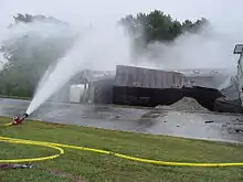 ![]() US Army tanks on a derailed flatbed car | ![]() Fire Department using a ground monitor to suppress vapors. | ![]() A crushed tank car involved in the derailment |