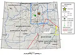 The 2002 Hindu Kush earthquakes struck in northern Afghanistan during the month of March. At least 166 people were killed with a very large and intermediate-depth mainshock on March 3. Three weeks later, at least 1,200 were killed during a moderate but shallow event that had a maximum Mercalli intensity of VII (Very strong). The M7.4 and M6.1 reverse events were focused in the Hindu Kush mountain range area.[1][2]