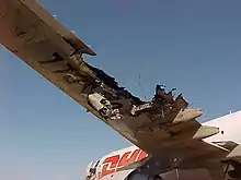 On 22 November 2003, shortly after takeoff from Baghdad, Iraq, an Airbus A300B2-200F cargo plane, registered OO-DLL and owned by European Air Transport (doing business as DHL Express), was struck on the left wing by a surface-to-air missile while on a scheduled flight to Muharraq, Bahrain.[1] Severe wing damage resulted in a fire and complete loss of hydraulic flight control systems. Because outboard left wing fuel tank 1A was full at takeoff, no fuel-air vapour explosion occurred. Liquid jet fuel dropped away as 1A disintegrated. Inboard fuel tank 1 was pierced and leaking.[2]
