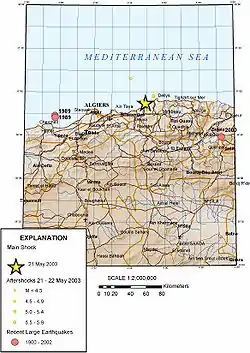 Northern Algeria is situated at the boundary between the African Plate and the Eurasian Plate, thus creating a zone of compression. This zone of compression manifests itself by several thrust and faults.[5] Due to this location between two tectonic plates, many earthquakes occurred in the region.[6] The mechanism of the earthquake on May 21 corresponds to a northeast-striking thrust fault named Zemmouri fault which was identified for the first time after this earthquake.[5] According to the United States Geological Survey,
