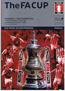 Both clubs received an allocation of approximately 25,000 tickets, with the remaining 25,000 being sent out to other clubs.[23] 17,500 of those tickets were available to Southampton season ticket holders.[24] Seat prices for the final exceeded £80, with the cheapest tickets available at £25.[24] Southampton was given the South Stand, which was the larger end of the stadium, whereas Arsenal was situated at the opposite end.[24] Although Southampton supporters were disappointed at the allocation share, chairman Rupert Lowe refused to criticise the FA's decision, by saying: "The reality is that too many people want to go and there are never enough tickets."[25] In the lead up to the final, the South Wales Echo reported that many tickets were being sold on the black market, for "20 times" the face-value price.[23]